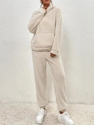 Kadın uzun kollu kapşonlu önden cepli peluş alt ve üst ikili takım
