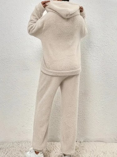 • Kadın uzun kollu kapşonlu önden cepli peluş alt ve üst ikili takım