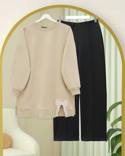 • Yuvarlak Yaka Eteği Fiyonk Detaylı Salaş Penye Tunik Bej
