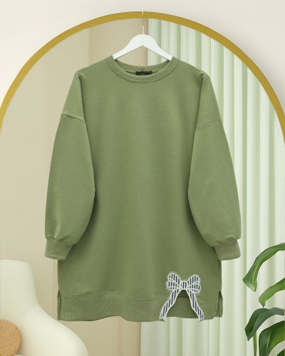 • Yuvarlak Yaka Eteği Fiyonk Detaylı Salaş Penye Tunik Çağla Y