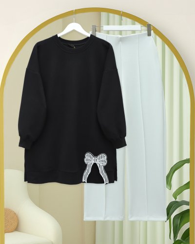 • Yuvarlak Yaka Eteği Fiyonk Detaylı Salaş Penye Tunik Siyah
